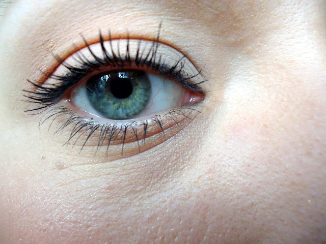 Faktem jest, że tusz jest trwały i nie kruszy się, wydłuża rzęsy, jednak aby uzyskać taki efekt należy się mocno napracować. Jedna warstwa to dla niego zdecydowanie za mało, jednak po dwóch skleja rzęsy niesamowicie, tworząc "musze nóżki". Co do pogrubienia... bynajmniej nie zauważyłam żadnego! Nic, kompletnie, zdecydowanie nie polecam, jeśli ktoś ma rzadkie rzęsy. Spodziewałam się czegoś lepszego, za tą cenę (38zł).